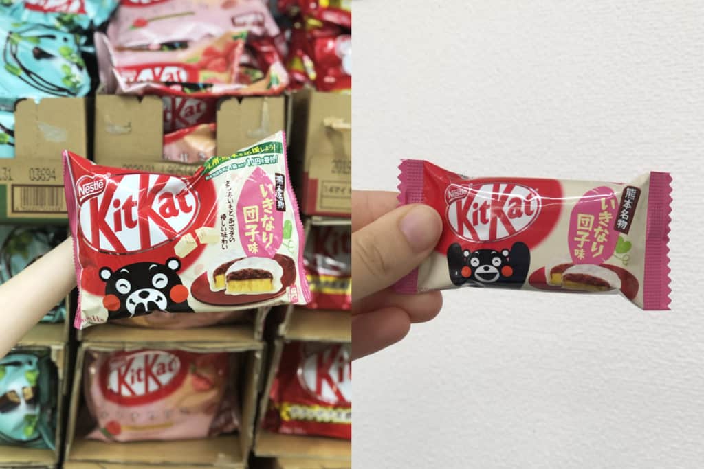 Another (better) backstory for this KitKat! This flavour was actually a collaboration between Nestle Japan and the Kumamoto Prefecture using their famous mascot, Kumamon, a black bear with rosy cheeks. The reason for the partnership is because of a 2016 natural disaster in Kumamoto: a series of earthquakes damaged the regions 400-year-old castle and displaced many local residents. Nestle Japan stepped in and created this KitKat to help raise funds to rebuild the prefecture. Ikinari Dango is Kumamoto’s most famous sweet snack, which is a sweet bun filled with red bean paste and sweet potato then covered in a rice wrapper to be steamed.