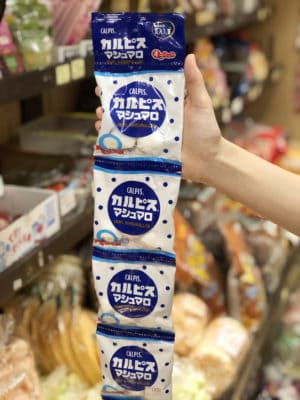 169 JPY for 4 bags: It smells like Calpis (of course). Really fluffy, like a normal marshmallow but has Calpis jam inside.